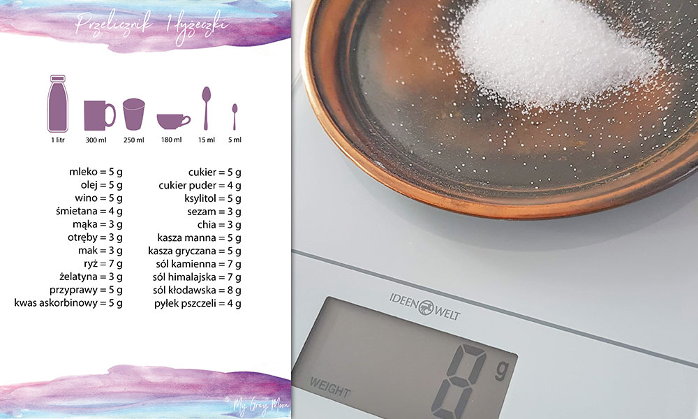 Często i gęsto nie chce mi się przeliczać za każdym razem czegokolwiek. Postanowiłam kiedyś i tak też zrobiłam, że zbiorę wszystko w jednym. Że wydrukuję, powieszę na lodówce i po sprawie. Oczywiście zabierałam się do tego jak pies do jeża, aż w końcu zmęczona przeliczaniem przy kolejnych „kuchennych rewolucjach” postanowiłam usiąść na tyłku i zrobić ten spis wagowy produktów w przeliczeniu z 1 łyżeczki. Łyżeczki od herbaty, takiej zwykłej małej jakiej używamy na co dzień. Jej miara w ml i w gramach jest zazwyczaj taka sama, dla każdej łyżeczki, a bynajmniej bardzo zbliżona.