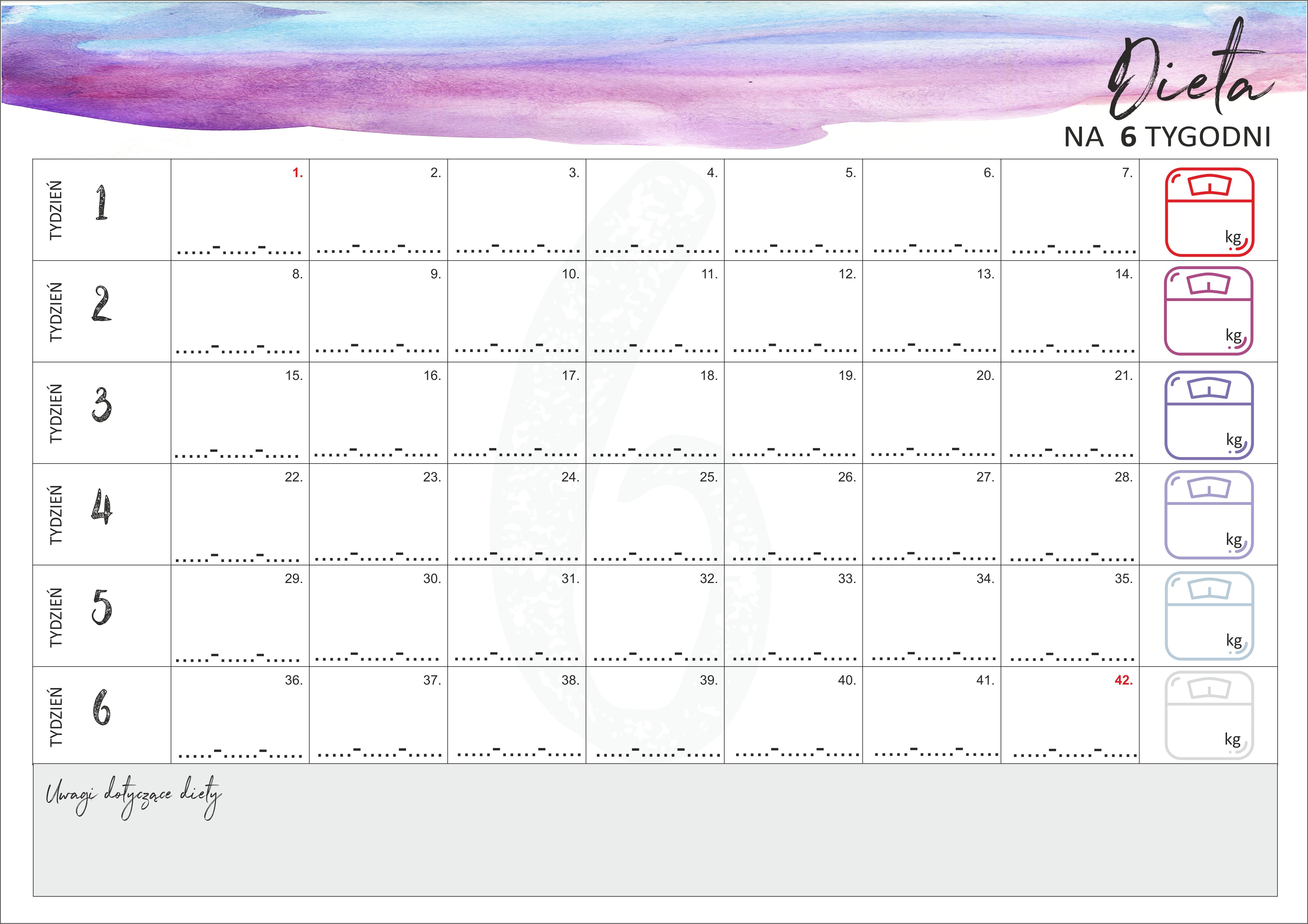 Tak na zakończenie mojego podsumowania, chciałam wam przekazać do samodzielnego wydrukowania tzw. pomocnik w całym tym postanowieniu. Pomoże on przede wszystkim skontrolować wagę, ale głównym zadaniem jest zapisywanie każdego dnia, to co zjedliście lub jak się czujecie, jakie macie zauważalne zmiany w wyglądzie czy samopoczuciu. To ważne informacje, bo zawsze możecie do nich wrócić, aby sprawdzić co Wam służy bardziej lub mniej. Ważyłam się raz w tygodniu i innym też tak radzę. Nie ma sensu ważyć się codziennie, no chyba, że ważycie się wagą kuchenną z trzema miejscami po przecinku :-D.